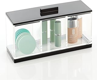 mDesign プラスチックメイクアップオーガナイザー ストレージキャニスターボックス 3つのセクションと蓋付き バスルームの化粧台カウンタートップに コットンボール 綿棒 丸 口紅用 クリア/ブラック