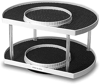 Stow-n-Spin (ホワイト、ダブルデラックス) 2段 レイジー・スーザン ターンテーブル スパイスラック オーガナイザー 回転スパイスホルダーシェルフ 3つのスピナー付き 調味料整理ラック スパイス用 ダブルデラックススパイスラック キャビネット用 深さ11インチの棚付き