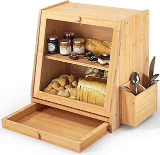 大きな竹製パンボックス キッチンカウンター用 - 2層 素朴なパンストレージ Laura's Green Kitchen - 木製ボックス ファームハウススタイル パン容器 窓付き - 長さ15.8インチ x 幅6.8インチ x 高さ12.2インチ