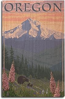 ランタン プレス マウント フード オレゴン 熊 家族 春の花 木製ウォールサイン (10x15 素朴なホームデコ すぐに掛けられます)