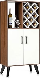 Giantex ビュッフェサイドボード 自立式ワインキャビネット ボトル8本 木製ワインラック クレデンザ 2ドアパントリーキャビネット キッチン ダイニングルーム 食器棚 リビングルーム オープンストレージシェルフ (ホワイト&ウォールナット)