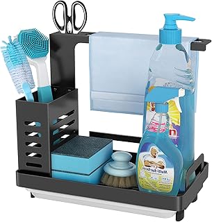 キッチンシンクキャディオーガナイザー シンク用スポンジホルダー ソープブラシディスペンサーホルダー ラグラック付き 吸盤 ディッシュクロスホルダー カウンタートップ用 壁取り付け用 ステンレススチール 防錆 (ブラック)